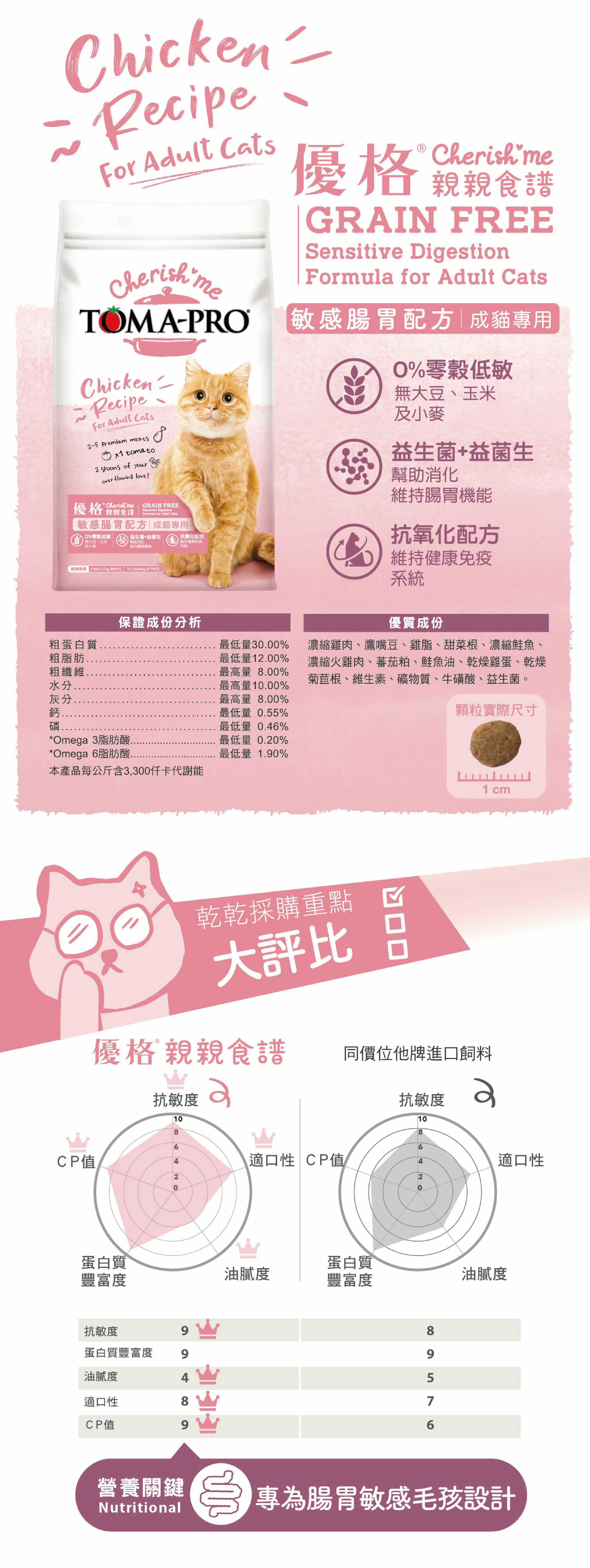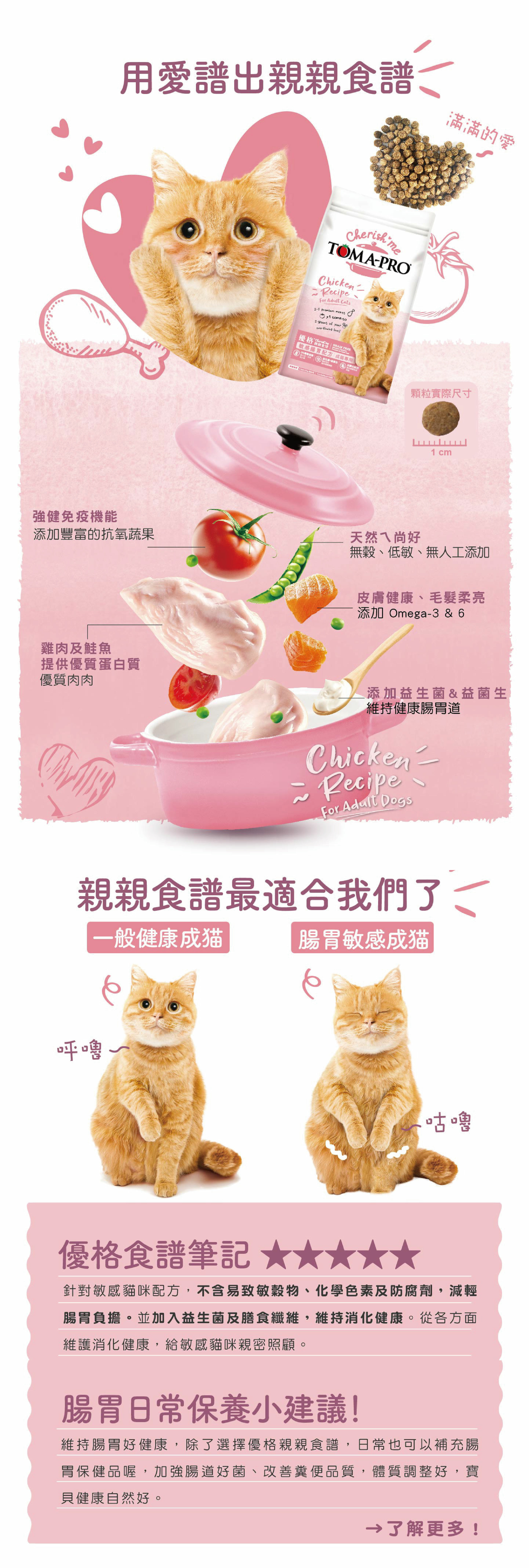 『親親食譜』由動物營養專家設計,針對敏感貓咪所設計,從各方面維護消化健康,減輕腸胃負擔。