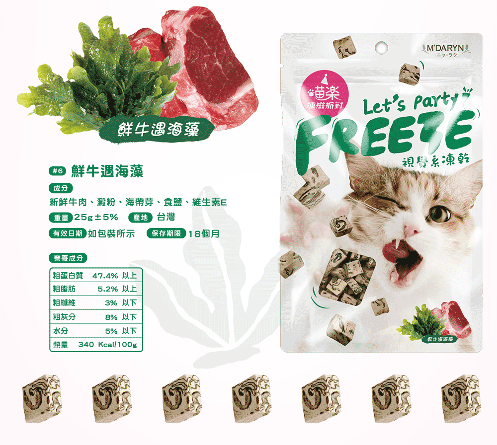 只有凍乾肉肉的零食,是否有些無趣?凍滋派對加入看得見的多元食材,鑲嵌在每顆凍乾顆粒上,帶給貓咪多層次的好滋味與營養。食材採用台灣在地雞肉,是優質蛋白質和不飽和脂肪酸的來源,搭配來自大海的超級食物細切海藻,可增進貓咪腸胃健康與免疫力,適宜的大小與口感,一口接一口收服傲嬌貓貓 !