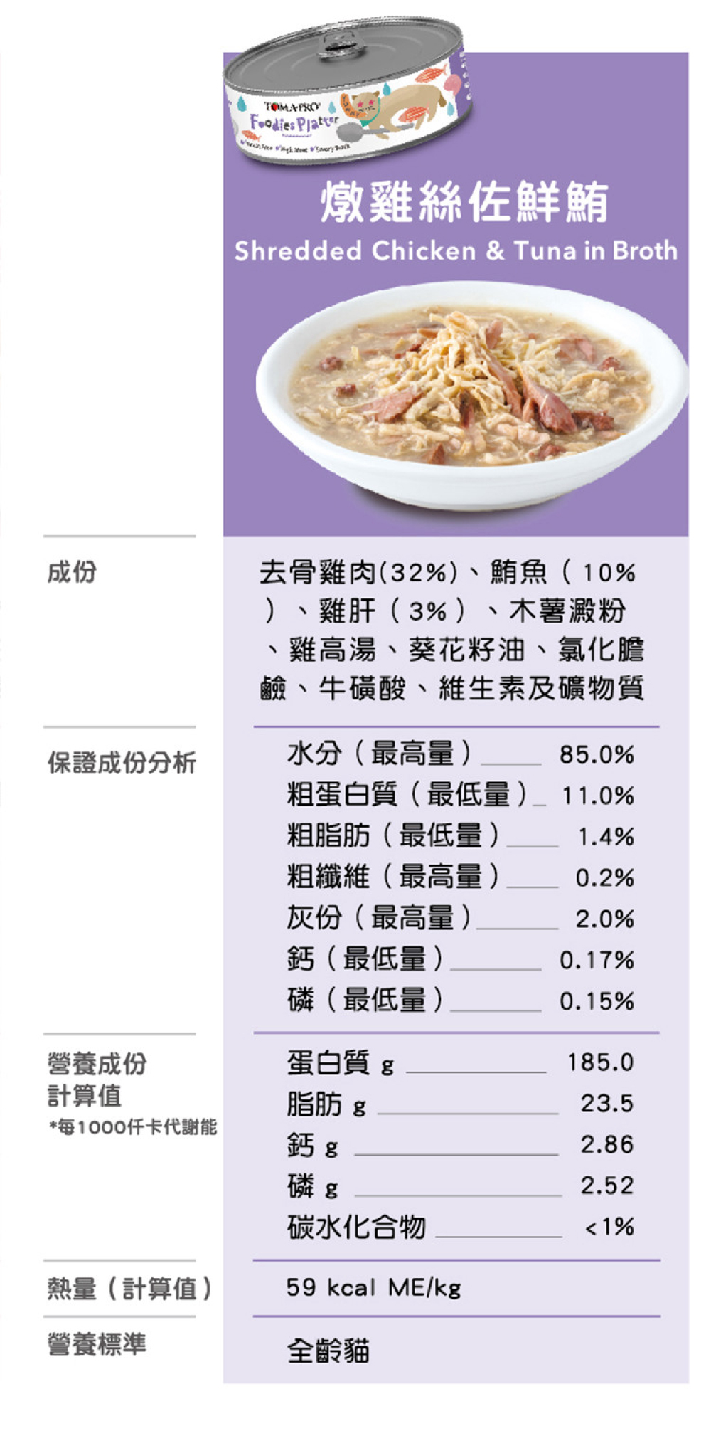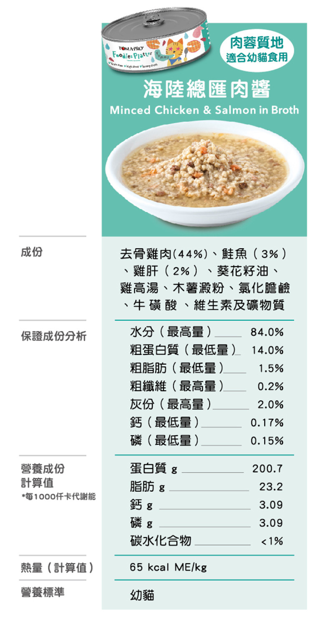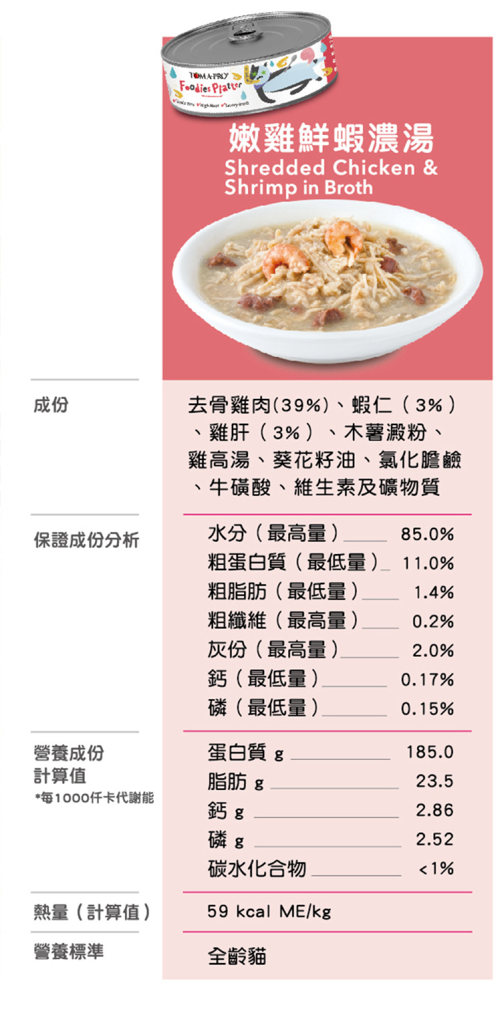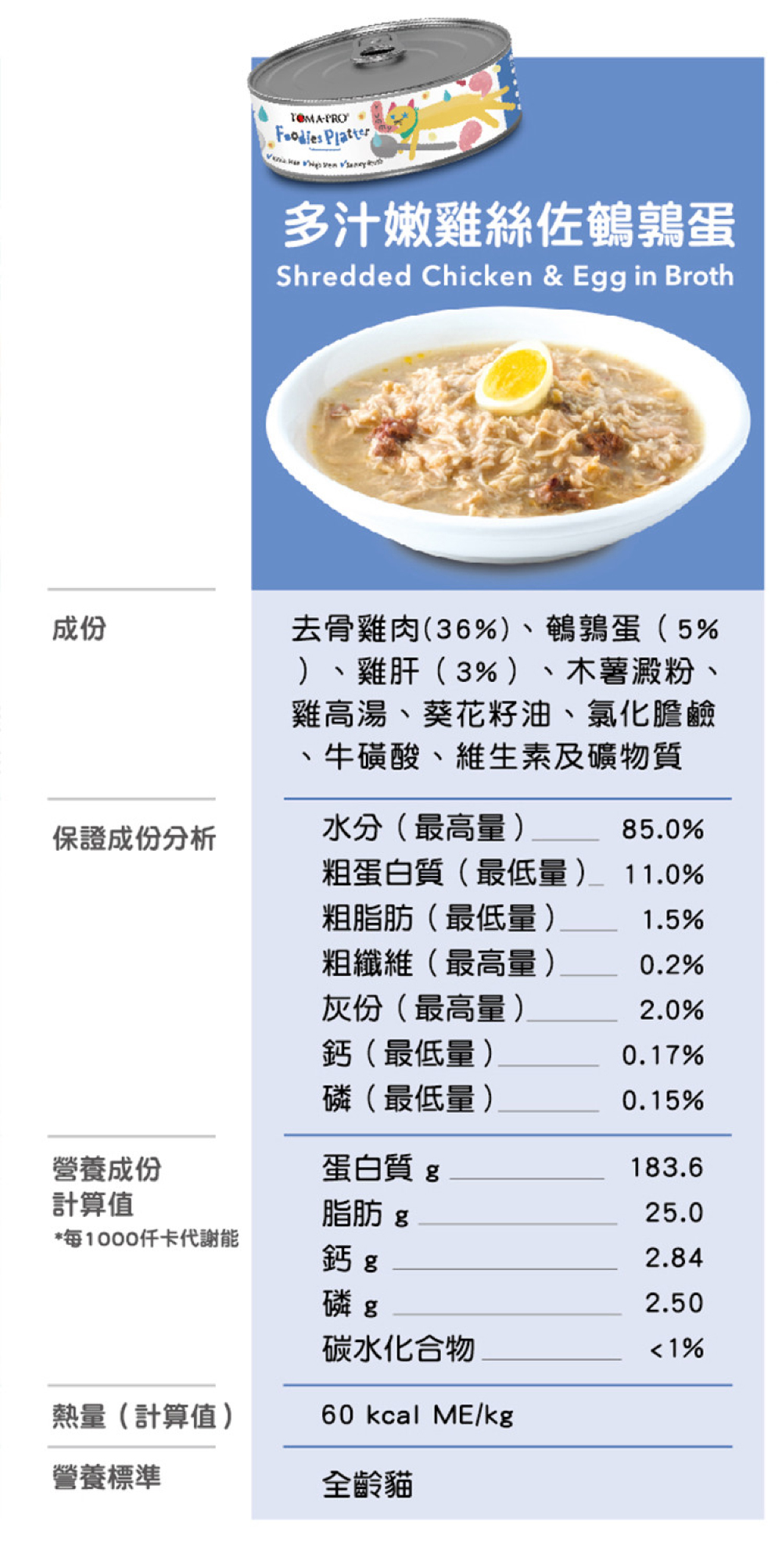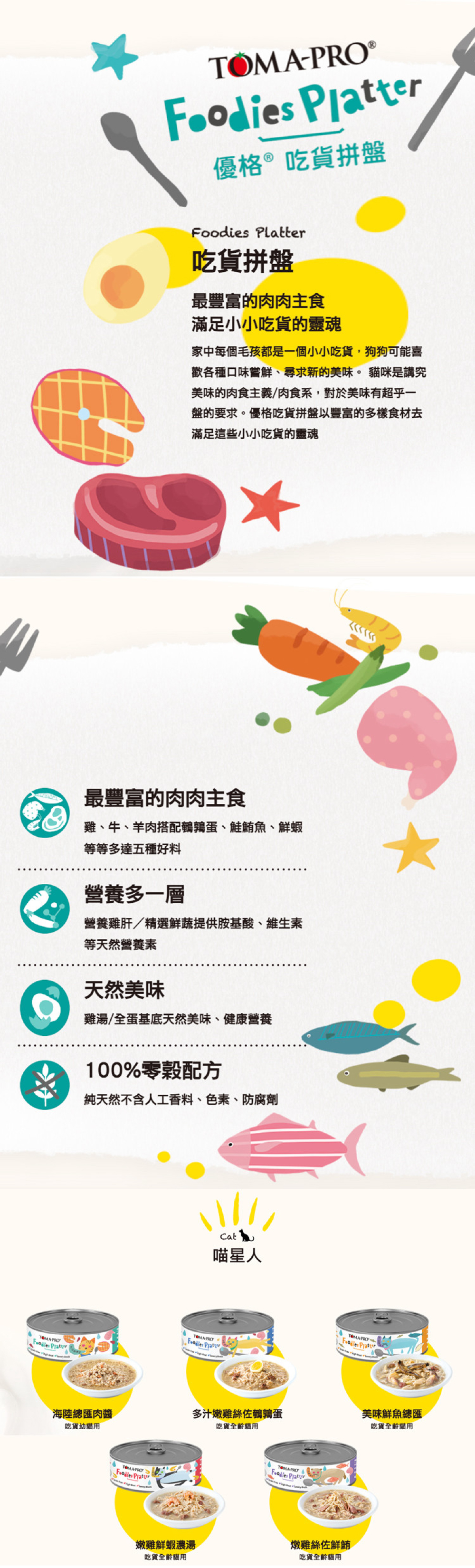 · 最豐富的肉肉主食罐 去骨雞肉搭配鵪鶉蛋、魚、蝦、鮭、鮪、鯷魚等豐富配料